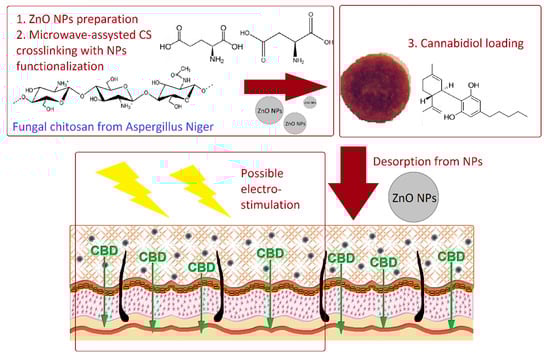 One of the most common neurological diseases is epilepsy, which not only negatively affects the quality of people’s life but also may lead to life-threatening situations when its symptoms such as seizures cannot be controlled medically. A very serious problem to be overcame is the untreatable form of this disease, which cannot be cured by any currently available medicines. Cannabidiol, which is a natural product obtained from Cannabis Sativa, brings a new hope to people suffering from drug-resistant epilepsy. However, the hydrophobic character of this compound significantly lowers its clinical efficiency. One of the promising methods of this substance bioactivity increase is delivery through the skin tissue. In this article, a new type of advanced transdermal systems based on chitosan and ZnO nanoparticles (NPs) has been developed according to Sustained Development principles. The chemical modification of the biopolymer confirmed by FT-IR method resulted in the preparation of the material with great swelling abilities and appropriate water vapor permeability. Obtained nanoparticles were investigated over their crystalline structure and morphology and their positive impact on drug loading capacity and cannabidiol controlled release was proved. The novel biomaterials were confirmed to have conductive properties and not be cytotoxic to L929 mouse fibroblasts.