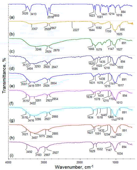 FT-IR spectra:(a) cannabidiol; (b) pure chitosan; (c) chitosan crosslinked with L-aspartic and L-glutamic acid; (d) CS-ZnO-1; (e) CS-ZnO-2; (f) CS-ZnO-3; (g) CS-ZnO-4; (h) CS-ZnO-5; and (i) CS-ZnO-6.