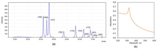 To confirm ZnO nanoparticles preparation, XRD and UV-Vis analyses were carried out. The results given in Figure 3a clearly proves ZnO NPs obtainment since the reflections are in line with other researcher’s data and are typical for this nanomaterial. ZnO nanoparticles have a wurtzite of nanocrystal structure with centro-simmetric character. The structure is composed of Zn cations and O anions. The constants for a crystalline unit are 3.21 and 5.21 Å. UV-Vis spectrum (Figure 3b) exhibits a broad band with the maximum at 380 nm typical for pure ZnO nanoparticles [,,].