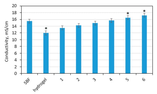 Conductivity of the prepared transdermal systems: (1) CS-ZnO-1; (2) CS-ZnO-2; (3) CS-ZnO-3; (4) CS-ZnO-4; (5) CS-ZnO-5; and (6) CS-ZnO-6. (* p < 0.05).