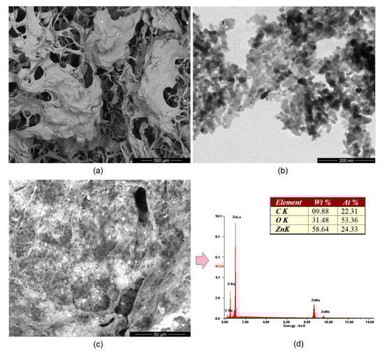 (a) SEM microphotograph of the chitosan hydrogel crosslinked with amino acids; (b) TEM microphotograph of the prepared ZnO nanoparticles; (c) SEM microphotograph of the hydrogel modified with ZnO nanoparticles (CS-ZnO-6); and (d) elemental analysis of the sample surface (CS-ZnO-6).