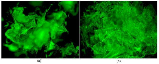 To investigate the morphology of the swollen samples, optical microscope with epifluorescence adapter was used (Figure 7). It can be noticed that, even after solution sorption, the samples (empty hydrogel (Figure 7a) and hydrogel modified with ZnO NPs containing CBD (Figure 7b)) are porous and with well-developed surface area. In addition, there is a small difference in the morphology of the sample with and without the addition of NPs. It can be noticed that ZnO-modified polymeric matrix is more curved and rigid, and some NPs covered with CBD are visible, which are quite homogenously distributed.