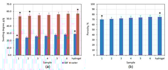 Swelling capacity was investigated by determining the amount of the swelling medium absorbed after 1 h (distilled water and SBF) based on the weight change of the sample. The SD (swelling degree) was calculated using Equation (1):