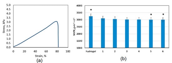 (a) tensile strength of the swollen hydrogel; and (b) water vapor permeability. (* p < 0.05).