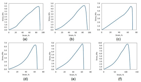 Tensile strength of the hydrogels containing: ZnO (a) CS-ZnO-1; (b) CS-ZnO-2; (c) CS-ZnO-3; (d) CS-ZnO-4; (e) CS-ZnO-5; and (f) CS-ZnO-6.
