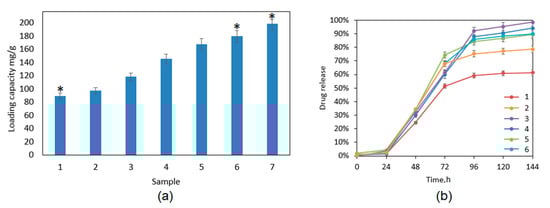 (a) Drug loading capacity: (1) hydrogel; (2) CS-ZnO-1; (3) CS-ZnO-2; (4) CS-ZnO-3; (5) CS-ZnO-4; (6) CS-ZnO-5; and (7) CS-ZnO-6. (b) Cannabidiol release profile in time (six days): (1) hydrogel; (2) CS-ZnO-1; (3) CS-ZnO-2; (4) CS-ZnO-3; (5) CS-ZnO-4; and (6) CS-ZnO-5. (* p < 0.05).