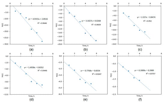 The in vitro drug release study was carried out under modified sink conditions using simulated body fluid as acceptor medium (pH = 5.5) by the method described by other researchers []. The temperature was 37 °C. The experiments lasted six days (until complete drug release for at least one sample). The amount of CBD being released was measured by UV-Vis spectroscopy. Kinetics of the drug release process was using Equations (4)–(7):