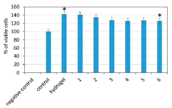 XTT assay carried out on L929 mouse fibroblasts after 48 h: (1) CS-ZnO-1; (2) CS-ZnO-2; (3) CS-ZnO-3; (4) CS-ZnO-4; (5) CS-ZnO-5; and (6) CS-ZnO-6. (* p < 0.05).