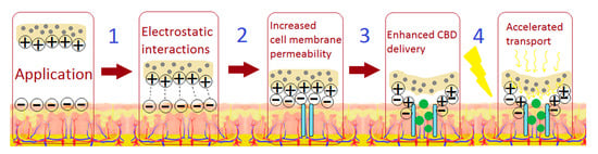 Based on the obtained results, Figure 15 presents possible applications of the newly developed stimuli-responsive transdermal systems for controlled CBD delivery, namely by traditional placing of the patch on skin or with the use of electric field (iontophoresis) [].