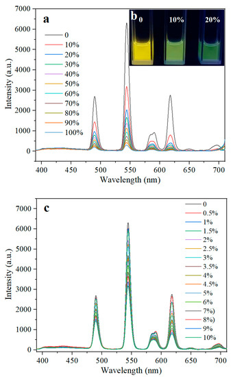 Most of the luminescent materials as trace detectors consisting of a single emission center are susceptible to many factors, from the detector concentration, excitation power, and optoelectronic system drift [43]. Eu/Tb mixed LnMOFs employed for detection could be self-calibrated. Herein, the fluorescent water sensing properties of Eu/Tb-PMA-MPEG are also evaluated. Figure 8a shows the fluorescence spectra of Eu/Tb-PMA-MPEG (Eu:Tb = 1:1). The fluorescence spectra of Eu/Tb-PMA-MPEG exhibit both the typical emission peaks of Eu ions (at 592 nm and 617 nm) and the typical emission peaks of Tb ions (at 490 nm and 544 nm). The fluorescence intensity ITb (at 544 nm, typical green luminescence of Tb ions) is much stronger than IEu (617 nm, typical red luminescence of Eu ions) due to the different coordination ability and excited state energy levels of Tb and Eu ions. The peaks at 544 nm and 617 nm in pure DMF are very strong; when the water content reaches 10%, ITb/IEu dramatically decreases, and the reason is that the quenching efficiency of water to Eu3+ is higher than Tb3+ [13]. As the water content increases from 0 to 10%, the fluorescence intensity of Eu3+ quenches more significantly than Tb3+, which eventually leads to a substantial increase in ITb/IEu. The water content from 10% to 40%, ITb/IEu gradually decreases. The change that occurs in response to DMF with a water content of 0%–10%–20% (v/v) is visible to the naked eye (Figure 8b), and the weak emission peak of Eu3+ at 652 nm and 696 nm disappeared when the water content reaches 20%. Then from 60% to 100%, ITb/IEu had little change (Figure 8d). Further, the fluorescence spectra of the Eu/Tb-PMA-MPEG in DMF solutions containing trace water from 0% to 10% are investigated (Figure 8c), as seen from Figure 8c, ITb and IEu gradually decrease, the insert Figure 8e shows ITb/IEu versus the water content is a good match for a linear relationship, and the linear equation is y = 2.39 + 17.69x (R2 = 0.997). A promising value as compared with the previously literature [44], where lanthanide-based solid-state sensors could achieve the quantitative detection over the range 10–120,000 ppm H2O in D2O. With the aid of dual-response luminescence centers, the mixed Eu/Tb-PMA-MPEG has promising potential application as ratiometric nanosensor in the field of trace water detection in the chemical industry.
