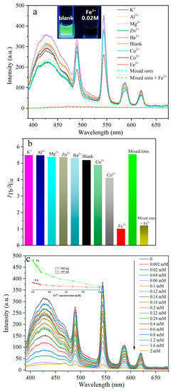 Fe3+ is an essential trace element in most physiological processes and it is also significant in water quality assessment. Therefore, the detection of Fe3+ is critical for the early identification and diagnosis of diseases caused by its excess or deficiency [45]. To evaluate the sensitivity and selectivity of Eu/Tb-PMA-MPEG to different metal ions, changes in fluorescence properties of Eu/Tb-PMA-MPEG upon addition of various metal ion salts or mixed metal ion salts are investigated (Figure 9a). The change in ITb/IEu of Eu/Tb-PMA-MPEG in the absence or presence of metal ions or mixed metal ions is presented in Figure 9b, where ITb is the fluorescence intensity of Tb3+ ions at 544 nm and IEu is the fluorescence intensity of Eu3+ ions at 617 nm. Significant fluorescent quenching is observed for Eu/Tb-PMA-MPEG solution in the presence of Fe3+ ions with a concentration of 0.02 M under the excitation of 360 nm (Figure 9a), while the solutions with the same concentration of other metal ions result in small (in the case of Co2+ ion) or no obvious (in the case of K+, Al3+, Mg2+, Zn2+, Ba2+, Cu2+ ions) fluorescence changes. The potential interfering ions are also tested to check the selectivity of Eu/Tb-PMA-MPEG towards metal ions. Common mixed metal ions (including K+, Al3+, Mg2+, Zn2+, Ba2+, Cu2+ and Co2+) were tested at the same concentration of each ion as Fe3+ ions (0.02 M). The significant decay on photoluminescence intensity of mixed metal ions containing Fe3+ ions is observed under the excitation of 360 nm while there is slight increase in fluorescence intensity of mixed metal ions, as compared to that of Eu/Tb-PMA-MPEG aqueous solution (blank sample). These results show that the high sensitivity and selectivity of as-prepared Eu/Tb-PMA-MPEG toward Fe3+ ions compared to other metal ions, and there was no interference with other metal ions, indicating that Eu/Tb-PMA-MPEG is a stable luminescent Fe3+ sensor [46].