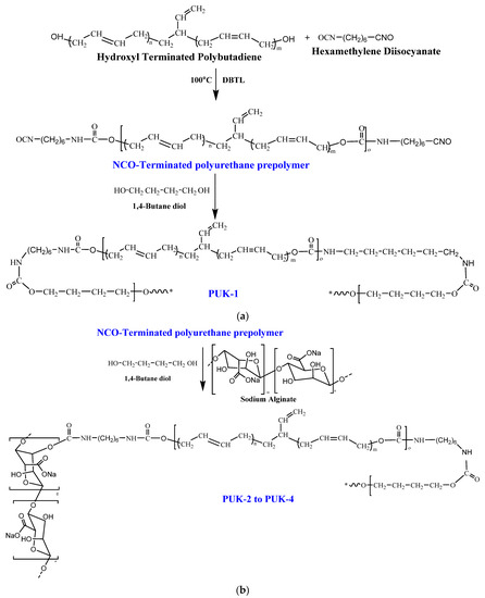 PU was synthesized by condensation polymerization of hexamethylene diisocyanate (HMDI) and hydroxyl-terminated polybutadiene (HTPB) [21,22]. The sample PUK-1 was prepared in two steps; in the first step, the PU-prepolymer was synthesized by the reaction of HTPB and HMDI with a mole ratio of 1:3, respectively, under a blanket of inert media of dry N2, and the reaction temperature was maintained at 100 °C. The progress of the reaction was monitored by measuring –NCO contents using FTIR and the back titration method. After the preparation of the prepolymer, the PU was further extended by chain extender (1,4-BDO). The 1,4-BDO was added to the reaction mixture with vigorous stirring to get final the PU. After the completion of the reaction, the trapped moisture was evolved by keeping the polymer sample in a vacuum prior to casting. The polymer was cured in an oven with a hot-air-circulating heating system for 24 h. Cured samples of polymers were kept for one week prior to testing at room temperature (25 °C) and a humidity level of 40%. Figure 1a shows systematic explanation for the preparation of PUs.