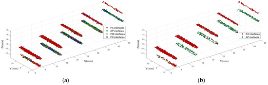 From Table 1, the PA interfaces are identified well at all depths. Compared with the PA interfaces, both the correct identification rates and the numbers of points of the AP interfaces are lower. However, for AP interfaces I–IV, the AP points are still the most. For void V, the identification performance of the AP interface is poor. The reason could be that the interface was greatly out of focus, which caused strong attenuation of the THz waves. It also can be seen that the number of all points varied greatly with depth. Therefore, the depth could greatly influence the imaging performance of the voids.