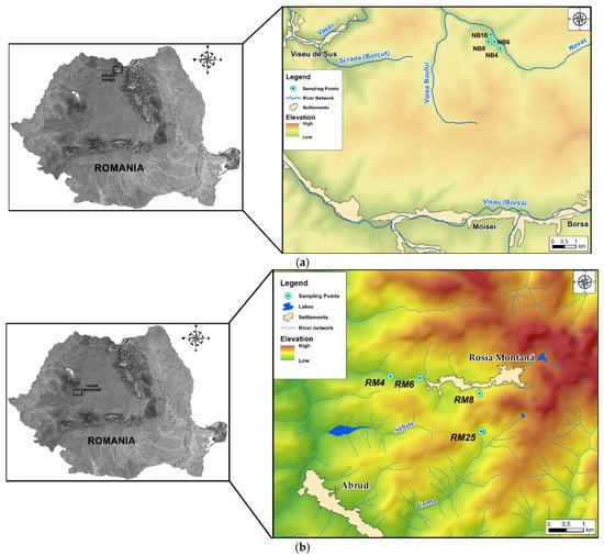 Map of the collected water samples: (a) Novăț-Borșa mining area, (b) Roșia Montană mining area.
