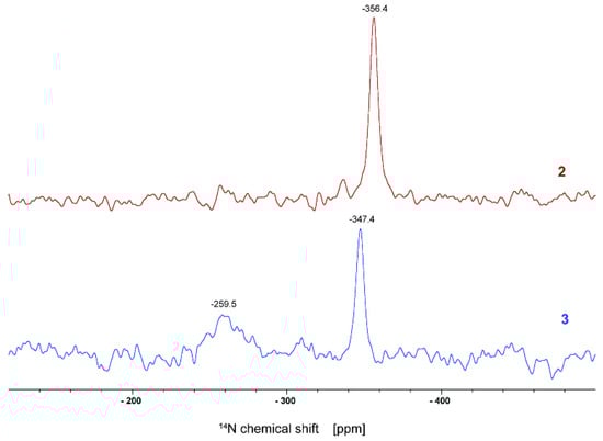 Considering the fact that CHIT-PAAA is solid and insoluble in water or organic solvents, NMR-spectra were recorded in solid state, i.e., as 13C ss-NMR and 15N ss-NMR spectra. As shown in Figure 2, there is only one signal in the 15N ss-NMR spectrum of chitosan, whereas two signals for nitrogen atoms can be observed in the spectrum of the final copolymer. The peak at −347.4 ppm of the copolymer is attributed to the −NH2 group of the chitosan chain, and the weaker broad peak at −259.5 ppm is assigned to the new amide bond (-NH-C=O), which appears after the covalent linkage of chitosan to the PBAAA by opening the lactone ring.