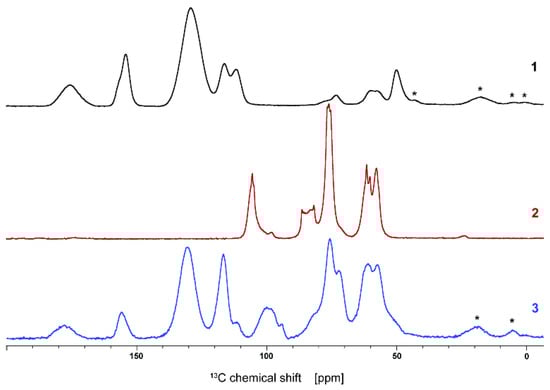 Significant changes were also seen in the 13C ss-NMR spectrum of the final copolymer compared with the starting materials (Figure 3). As a result of the attachment of the chitosan to the PBAAA chain, the peaks at around 50 ppm in the 13C ss-NMR spectra of PBAAA, typical for the –CH in the lactone units, do not appear in the 13C ss-NMR spectra of copolymer CHIT-PAAA. The peak in the 15–25 ppm region indicates -CH groups belonging to the chitosan chain. It was also present in the spectrum of the copolymer but was hidden under the sideband. Moreover, a significant additional change in the 13C ss-NMR spectrum of the copolymer was also observed in the aromatic part, where the signals for the peaks belonging to the benzene ring of PBAAA appeared due to the covalent linkage of the chitosan on the polymer chain.