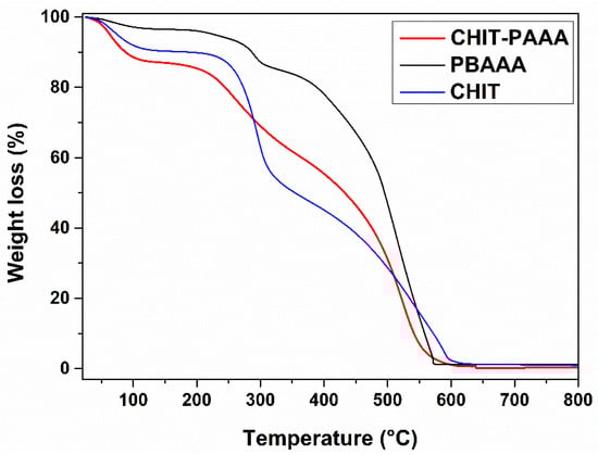 Figure 5 presents the TGA curves of CHIT, PBAAA and CHIT-PAAA, ranging from room temperature to 800 °C. CHIT underwent three degradation phases; first, between 39 °C–151°C (9.9% weight loss) corresponding to the elimination of water adsorbed in the polysaccharide structure; second, between 230 °C–360 °C (39% weight loss); and third, above 360 °C, attributed to total degradation. An increment in the decomposition trend of organic matter was observed in the case of CHIT-PAAA compared to PBAAA, due to the higher number of hydroxyl groups present after the covalent linkage of the polymer to the chitosan chain. Thus, an initial weight loss of 6.9% at 284 °C was recorded for PBAAA, associated with a decarboxylation process, followed by continuous degradation until 570 °C. Regarding the new material CHIT-PAAA, a 61% weight loss was observed in two steps; first, between 45 °C–105 °C (13% weight loss) and then between 200 °C–550 °C (48% weight loss), corresponding to the decomposition of the polysaccharide structure of the chitosan. The whole copolymer structure collapsed at 570 °C.