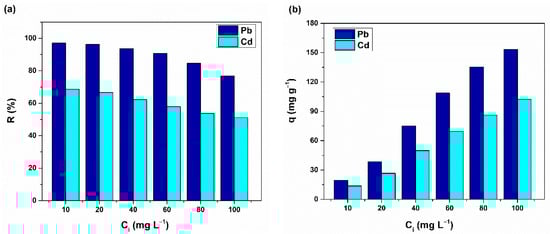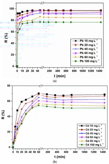 The experiments on stock solutions started with investigation of the effects induced by contact time and Pb and Cd initial concentrations on the adsorption efficiency and sorption capacity of CHIT-PAAA. As indicated in Figure 7a, Pb recorded very high removal efficiencies (90.63–96.07%) for a range of metal concentrations between 10–60 mg L−1. However, a decreasing trend (76.71–84.60%) can be noticed at high concentrations (80–100 mg L−1). Cd also recorded better adsorption efficiencies (62.20–68.60%) at low concentrations, compared with those obtained with elevated concentrations. As expected, sorption capacity increased proportionally to metal concentration (153.42 mg g−1 and 102.26 mg g−1 were obtained at 100 mg L−1 for Pb and Cd, respectively; Figure 7b).