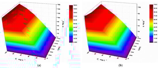 Based on the results obtained from the adsorption experiments, 3D adsorption models were developed for each metal. As can be seen in Figure 9, sorption capacity was directly influenced by contact time and initial metal concentrations, highlighting proportional dependencies between these variables.