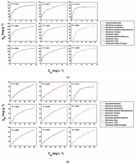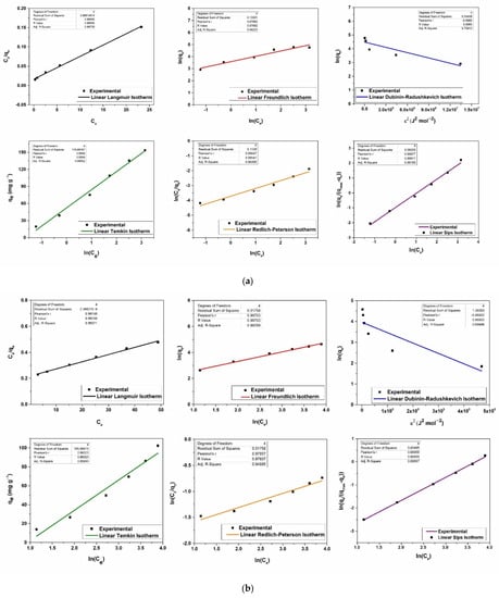 Pb and Cd adsorption equilibrium studies were carried out using 0.04 L metal stock solutions of six different concentrations (10, 20, 40, 60, 80, and 100 mg L−1) and 0.02 g adsorbent material for 24 h contact time. Linear and nonlinear forms of Langmuir [], Freundlich [], Dubinin–Radushkevich [], Temkin [], Khan [], Redlich–Peterson [], Sips [], Toth [] and Koble–Corrigan [] isotherm models were applied to fit the CHIT-PAAA experimental adsorption data. Table S1 summarizes the equations of the isotherms used in the current study. For the linear forms, the values of each isotherm constant were obtained from the slope and intercept of various plots: Ce/qe versus Ce (Langmuir 1st type), ln(qe) versus ln(Ce) (Freundlich), ln(qe) versus ε2 (Dubinin–Radushkevich), qe versus ln(Ce) (Temkin), ln(Ce/qe) versus ln(Ce) (Redlich–Peterson), ln(qe)/(qmax−qe)) versus ln(Ce) (Sips).