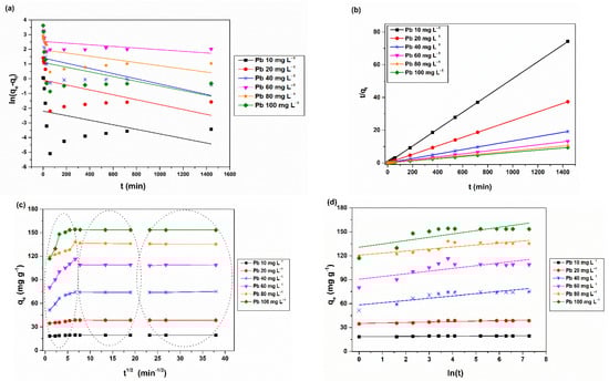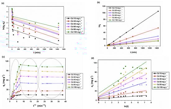 The prediction of batch adsorption kinetics was essential to describe the adsorption rates and sorbate interactions. The CHIT-PAAA kinetic experiments were conducted using 0.04 g adsorbent material and 0.08 L metal solutions of 10, 20, 40, 60, 80 and 100 mg L−1 concentrations. Samples were collected from each solution after 1 min, 5 min, 10 min, 20 min, 30 min, 45 min, 1 h, 3 h, 6 h, 9 h, 12 h, and 24 h of contact time, and heavy metals were determined via FAAS. Four types of kinetic models were applied to characterize the adsorption behaviour of CHIT-PAAA, namely the pseudo-first order [], pseudo-second order [], Weber–Morris intra-particle diffusion [], and Elovich model []. Table S2 summarizes the equations of the models used to determine the adsorption kinetics of Pb and Cd onto CHIT-PAAA. Another useful kinetic parameter is the adsorption half-time () which represents the amount of time needed to attain half the adsorption progress or half the equilibrium value [,]. This parameter can be calculated as follows: