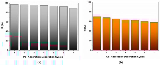 The conducted recyclability study showed that CHIT-PAAA removal efficiency decreased from 97.18% to 89% for Pb and from 70% to 58% for Cd after seven cycles of adsorption–desorption (Figure 14).