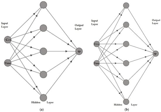 The high complexity of the adsorption process makes it difficult to model only through statistical methods. Therefore, computational intelligence models such as adaptive fuzzy inference systems (ANFIS), least square support vector regression (LSSVR), random forest (RF), or artificial neural networks (ANNs), which rely on artificial intelligence (AI) prediction, represent some of the best methods for modeling complex datasets [,,,,,,,]. ANNs were first introduced by McCulloch and Pitts [], inspired by the structure and functions of biological neural networks, and have become a powerful tool for predicting system behaviors and for analyzing processes [,,,]. In general, ANNs consist of artificial neurons with specific weights, placed in various layers, interconnected through a system of artificial synapses that train interrelationships between inputs and outputs [].