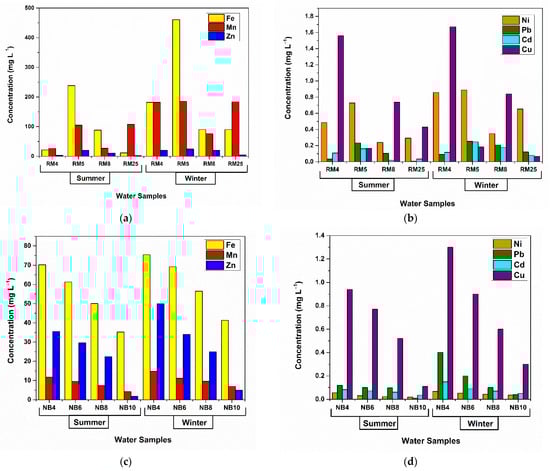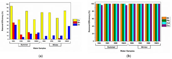Four water samples (Table S3) were collected in two seasons (summer and winter 2020) from two former mining areas in Romania (Novăț-Borșa and Roșia Montană, Figure 1). The map with the sampling points was developed using ArcGIS 10.6.1 (ESRI, Redlands, CA, USA). Novăț-Borșa is located in northern Romania, in the Maramureș Mountains (Maramureș County), close to the border with Ukraine. It has been an important source of lead and zinc ores (associated with copper, antimony, bismuth, cadmium, gold, and silver). Roșia Montană is situated in western Romania, in the Apuseni Mountains (Alba County) and has been exploited for its gold and silver ores. These two sampling areas were selected because they are considered among the most polluted sites in Romania, with soil, groundwater, and surface waters often reported to contain significant loads of heavy metals.