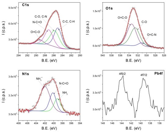 The changes occurring in the CHIT-PAAA structure after Pb and Cd sorption could easily be noticed in the infrared spectra of the copolymer (Figure S1). Equal amounts of material were used to make the pellets used for FTIR determination, and all obtained spectra were normalized after recording. Important modifications emerged in the 350–600 cm−1 wavenumber range, namely the intensification of Pb-O, Cd-O bands at 462 cm−1 and 505 cm−1. Furthermore, other rises were seen in the bands belonging to C-O, C=C bonds from the benzene ring, and in the C-N, -N-H-, C=O bonds, located at 1072 cm−1, 1156 cm−1, 1245 cm−1, 1377–1435 cm−1, and 1513–1617 cm−1.