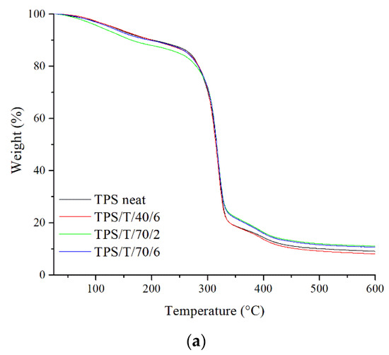 The TGA analyses were performed to study the influence of the tested scCO2 process and thymol loading on the thermal stability of the TPS and TPS–PCL samples. The TG and DTG curves are shown in Figure 5, while Table 3 reports the onset degradation temperature (Tonset), the maximum decomposition temperature (Tpeak), the weight loss, and the mass residue of the samples. The TPS samples, neat and impregnated, exhibit a very similar thermal profile with two degradation steps (Figure 5a). The first step is associated with the evaporation of free/bound water and glycerol decomposition from the TPS samples between 25 and 150 °C [41], which represented around 10% of weight reduction. After that, all the samples exhibited a thermal stability until around 280 °C (weight retention was maintained at 80% or higher). The second degradation step of the TPS samples starts around 290 °C. At this point, the weight loss is rapid until reaching the maximum degradation rate of around 319 °C. In this step, the starch chains began to degrade mainly due to the dehydration of the hydroxyl groups and the subsequent formation of unsaturated and aliphatic low molecular weight carbon species [42]. Finally, the last stage of thermal degradation is generally carbonization [43]. Alongside thermograms, DTG curves are given to emphasize the temperatures at which the mentioned changes happened (Figure 5b). Still, it can be seen that the scCO2 impregnation with thymol did not have any significant effect on the thermal stability of the examined thermoplastic starch.