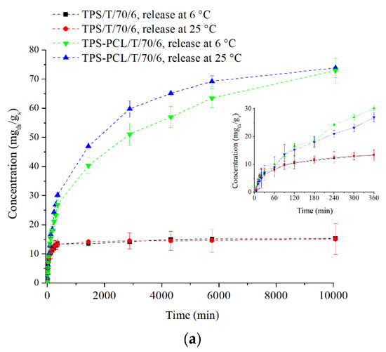 Food packaging materials with a high loading of active agents and a highly responsive nature have been in high demand in recent decades. As already mentioned, thymol is a phenolic monoterpene that has received considerable attention as an antimicrobial agent [22,27]. It also can be used as a possible food antioxidant [23]. Due to that fact, it was important to investigate in vitro thymol release from TPS and TPS–PCL samples at the storage temperature of the food on cooling shelves and room temperature in water (6 °C and 25 °C). Figure 6a shows plots of the concentration of released thymol from TPS and TPS–PCL samples treated with scCO2+thymol at 70 °C for 6 h versus different times. It can be seen that thymol release from the TPS/T/70/6 sample reached equilibrium within 6 h independent of the release temperature (Figure 6a, insert). The maximum concentration of thymol achieved for the release period was ca. 15 mgth/gs. Additionally, it can be seen that thymol release from the TPS–PCL blend was much higher compared to the TPS sample. In the case of TPS–PCL samples, the final concentration of released thymol, regardless of the release temperature, was very similar (ca. 73 mgth/gs). This result was expected, considering that thymol loading was significantly higher in the TPS–PCL sample than in the TPS sample (LTPS/T/70/6 = 2.1% and LTPS-PCL/T/70/6 = 15%). It is evident that a longer time was required to reach equilibrium when thymol was released from the TPS–PCL sample (Figure 6a). Moreover, an initially slightly faster thymol release rate was observed at 6 °C in the first 6 h of the release test, but as the experiment progressed, the release was faster at 25 °C. Overall, the controlled release of thymol from the TPS–PCL/T/70/6 sample was achieved over the course of 7 days, which is a promising result considering that after further processing this material could possibly be applied as a smart food packaging material.