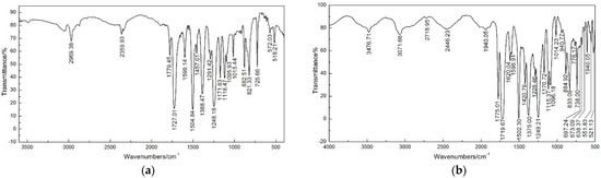In addition, the four films were analyzed by Fourier transform infrared (FTIR) spectra, and recorded, as shown in Figure 4. Spectra in the optical range of 400 cm−1 to 4000 cm−1 were obtained by averaging 32 scans at a resolution of 4 cm−1. The characteristic peaks of resultant PI are assigned in Table 3. By comparing the infrared spectra of the four films, no characteristic absorption peaks of polyamide acid were found at 1660 cm−1, 2900 cm−1 and 3200 cm−1, which indicated that the polyamide acid had been fully imidized.