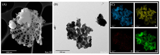 TEM image of raw DE (A), DE/ZnO-II (B), and EDS mapping image of DE/ZnO-II composite (C).