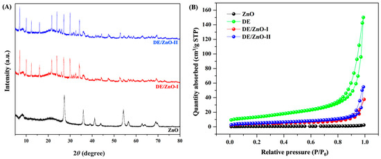 XRD pattern (A) and the BET isotherm (B) of ZnO and prepared DE/ZnO composite.