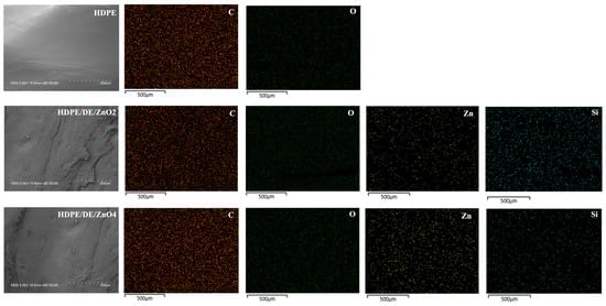 FE-SEM with an EDS mapping image of the neat HDPE and HDPE/DE/ZnO injection mold.
