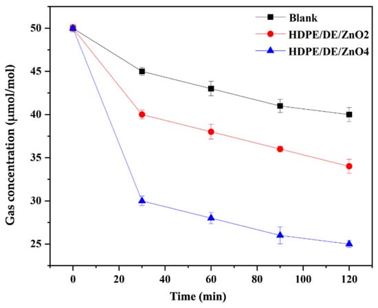 The determination of the odor reduction test results is shown in Figure 5. From these results, it can be concluded that the DE/ZnO composite has a high effect on HDPE in reducing TMA up to 37.5% within 120 min, which is notably different from the test specimen of pure HDPE. In this study, TMA was considered a representative volatile chemical because it is primarily detected in seafood products, which meets the purpose of the study. DE and ZnO can be utilized as affordable odor sensors capable of detecting the freshness of foods and beverages because of their continual sensitivity to TMA. Due to its physicochemical property and porous structure, DE has efficient adsorbent properties, and it has been observed that it may effectively reduce the fishy odor during low-temperature adsorption. In addition, ZnO may dissociate hydrogen in a heterogeneous manner, and a ZnO-tailored matrix would increase the number of positively charged volatile molecules with high adsorbent material potential [,,,].