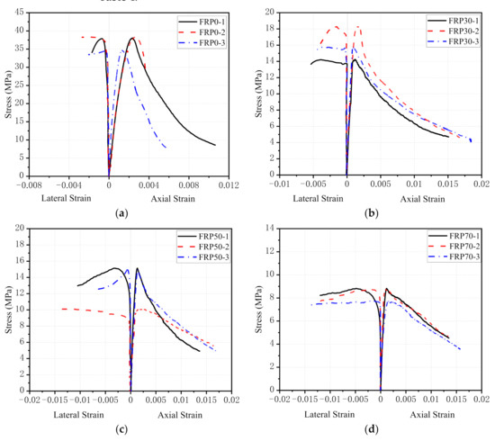 Figure 11 shows the relationship between axial strain and lateral strain for all specimens. For NAC specimens (FRP0 group), when the stress of concrete was low, the curve developed almost linearly. The slope of the curve increased sharply when the axial strain reached about 60–80% of the peak strain, which was caused by the rapid development of micro-cracks in concrete. For RFAC, the lateral deformation of the FRP30 group was larger than that of NCA concrete when . At larger , the lateral strain of NCA concrete increased rapidly until failure occurred, whereas the lateral strain of the FRP30 group increased much slower but reached much larger values than that of NCA concrete at failure. When the replacement ratio of RGFA ranged from 30% to 70%, the lateral strain increased with increasing replacement ratio under the same axial strain, which reflected that the more RGFA content resulted in a greater lateral expansion of concrete, as shown in Figure 7. When , the axial and lateral strain curve of the FRP100 was similar to that of FRP30. With the further increase of , the lateral strain of FRP100 was much larger than that of FRP30 at the same axial strain. However, the lateral strain of FRP100 was smaller than that of FRP70 and FRP50 at the same axial strain when the axial strain was larger than a certain value.