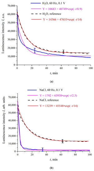 In addition, in some experiments we wrapped the flask containing the liquid sample with 10 μm-thick aluminum foil, and the sample was treated with electric pulses at 417 Hz repetition frequency. The results of this experiment are shown in Figure 10. It is seen that, in this case, no stochastic behavior was observed, and the luminescence intensity, I(t), coincides with a good accuracy with the reference curve. This is quite expected: the treatment effect in this case is absent due to the screening of the liquid sample.