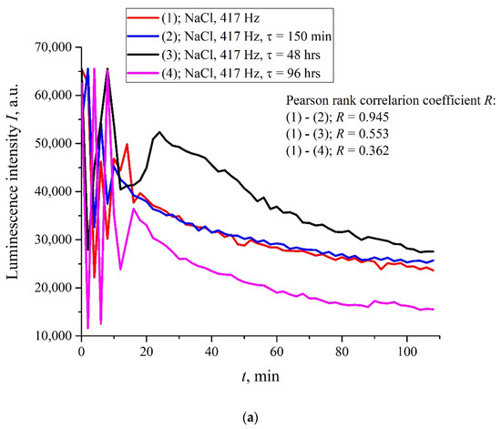The intensity I(t) for isotonic NaCl solution after processing at the 417 Hz pulse repetition rate. The difference between the graphs in panels (a,b) is that the measurements were made in different laboratories; the distance between the laboratories is 20 km. Here, τ is the time interval between the beginnings of the corresponding measurements. Pearson rank correlation coefficient was calculated for all values of τ.