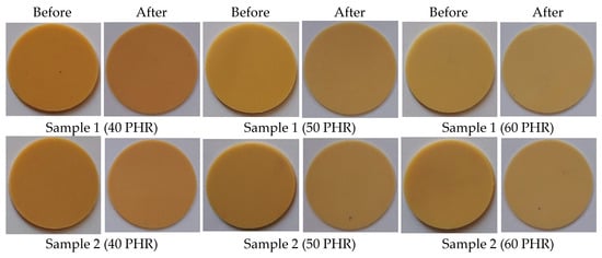 The appearance and color of the material are some of the most important factors affecting product quality and customer attraction. As shown in Figure 12, samples plasticized with commercial plasticizers (DINP and DEHP) definitely changed their color after the migration test. Samples were yellow before the test and maroon after. For samples prepared with synthesized plasticizers, their color almost did not change at all. The color change of the material is related to the degradation of PVC. It is well known that PVC degrades by dehydrochlorination at elevated temperatures, resulting in conjugated double bonds in the polymer chains and a noticeable color change (from yellow to pink, orange, red, brown, and finally black) when the sequences of conjugated polyenes contain more than four to five double bonds [,,,,]. In our study, the degradation was a result of a high migration of DINP and DEHP plasticizers shown in Figure 11, which makes the material more susceptible to degradation [].