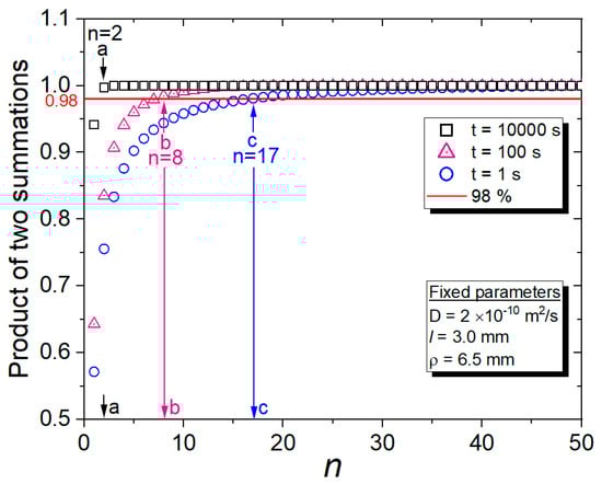Because Equation (3) has two infinite terms, we estimate that the finite number of terms (n) in the actual calculation of the two summations should be contained to obtain D and . Thus, we calculate the contributions in two summations of Equation (3), reaching n = 50 terms with three different times t. Figure 1 shows the normalized and calculated product of two summations versus n at three different times (t = 1 s, 100 s, and 10,000 s) at fixed parameters of l = 3.0 mm, ρ = 6.5 mm, and D = 2 × 10−10 m2/s. With increasing n up to 50, the products of the two summations for all t = 1 s, 100 s, and 10,000 s converge to 1 (the value when n is infinite). The horizontal red line in Figure 1 corresponds to a 0.98 value of converged value 1. The corresponding n-term value on the x-axis exceeds 0.98 on the y-axis, for which n should be contained in two summations as nearly equal to the converged value of 1. Thus, a, b, and c, which are obtained from the intersection between the 98% line and the product of two summations (data on y-axis), indicate the minimum number of terms, n, to be included in the summations; these values correspond to 2 at t = 10,000 s, 8 at t = 100 s, and 17 at t = 1 s, respectively, in n. When t is sufficiently greater than 10,000 s, the two terms of the two summations in Equation (3) mainly contribute to the value. However, if is less than , Equation (3) cannot easily converge, and eight more n terms are needed, as shown by arrow b in Figure 1. For the calculation with an uncertainty less than 2% using Equation (3), we should include many terms that are greater than the n = 64 terms (8 × 8) in the product of the two summations at t = 100 s. Thus, a dedicated calculation program is needed. We developed a diffusion analysis program to calculate D and , including up to n = 100 terms of the first summation and n = 50 terms of the second summation, reaching in Equation (3) for covering small time values, t = 1 s.