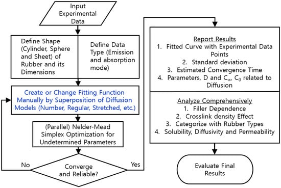 Figure 2 shows the overall flowchart of the diffusion analysis program developed to analyze the data using Equation (3) by a Nelder–Mead simplex nonlinear optimization algorithm []. As a result of the application of the developed program, the solubility, diffusivity, and permeability were finally obtained in a rubber composite system. The contents indicated by the blue color in Figure 2 are related to the selection of the solution to the diffusion equation of Equation (3); for this equation, we chose an appropriate diffusion model corresponding to the rubber shape and the number of superposition models.