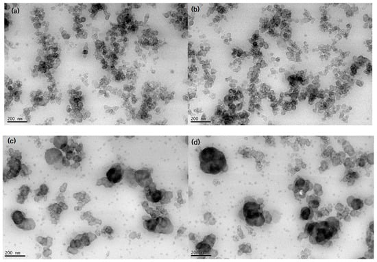 TEM image showing CB particles and aggregates in the CB-filled EPDM composite with (a,b) HAF20, and (c,d) SRF20. (a,b) were taken at different parts of the EPDM HAF20 specimen. (c,d) were taken at different parts of the EPDM SRF20 specimen.