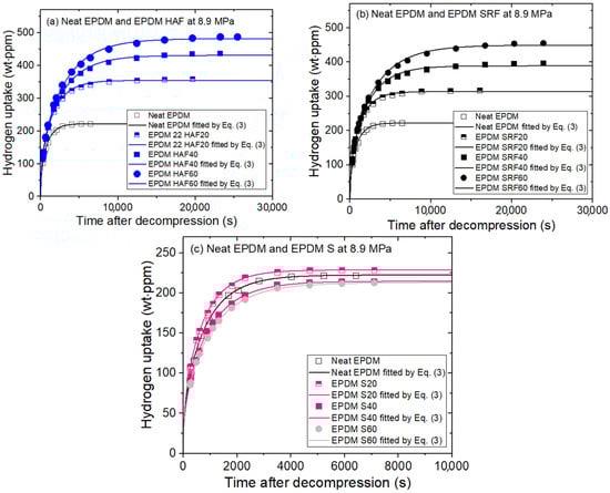 H2 uptake characteristics of the (a) EPDM HAF, (b) EPDM SRF, and (c) EPDM S series after hydrogen exposure at 8.9 MPa for 20 h and decompression. The solid lines are the least-squares fittings of Equation (3) using the diffusion analysis program. The results of neat EPDM are included in three panels for comparison with the EPDM composites blended with fillers.