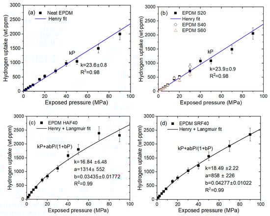 Relationship between H2 uptake () and exposure pressure for (a) neat EPDM, (b) EPDM S series, (c) EPDM HAF40, and (d) EPDM SRF40. The blue and black lines represent the Henry fit and the dual mode (Henry–Langmuir) fit, respectively. The legends show the linear least-squares fitting plots and their squared correlation coefficients (R2).