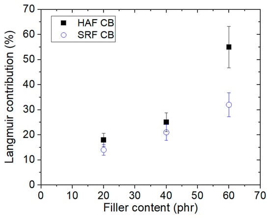 Langmuir contribution versus filler content for CB-filled EPDM composites.