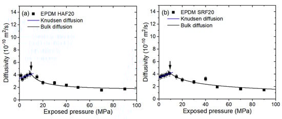 All EPDM composites blended with HAF CB and SRF CB fillers revealed similar diffusion behaviors versus pressure. To avoid redundancy, the representative pressure-dependent diffusion for EPDM HAF20 and SRF20, as shown in Figure 7a,b, respectively, can be divided into two contributions at the peak, as indicated by arrows. The contributions correspond to Knudsen diffusion for low pressure and bulk diffusion for high pressure. The pressure-dependent behavior for diffusivity is interpreted by the results of Knudsen diffusion below 7–10 MPa, and bulk diffusion above this pressure range; this combined diffusion was observed and analyzed by fractal theory in other studies [,]. Knudsen diffusion gradually increases with increasing pressure. Knudsen diffusion below the pressure range normally occurs when there is a large mean free path of diffusing gas molecules or a low gas density. The Knudsen diffusion coefficient () in porous media is expressed as follows []: