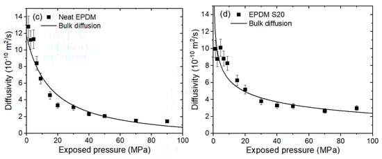 Moreover, the bulk diffusion for neat EPDM (Figure 7c) and EPDM S20 (Figure 7d), and the bulk diffusion above a critical pressure of 7–10 MPa for CB-filled EPDM composites, are inversely proportional to pressure; this phenomenon is associated with the mean free path between the H2 molecules. Bulk diffusion is predominant when the mean free path ( in large pores is smaller than the pore diameters, or when high-pressure gas diffusion occurs. The bulk diffusion coefficient ( is expressed as follows []: