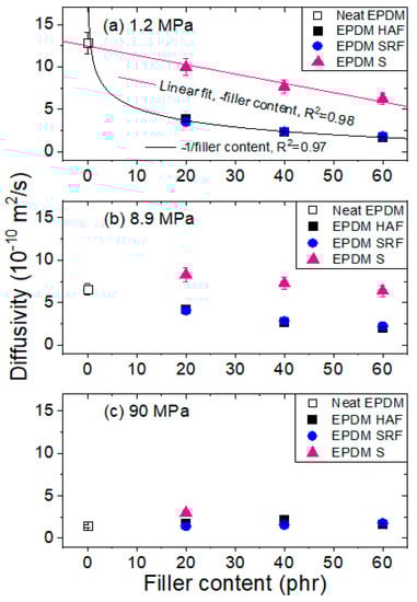 Figure 8a–c shows the variations in the diffusivity characteristics with the filler content at the three different pressures of 1.2 MPa, 8.9 MPa, and 90 MPa, respectively. At a low pressure of 1.2 MPa, all fillers extend the diffusion path due to increased tortuosity by the impermeable filler, resulting in a decrease in the diffusion rate. The diffusivity in the silica-blended EPDM is negative and it decreases linearly with increasing filler content; the diffusivity in the CB-blended EPDM decreases in the form of an asymptotic line (~1/filler content). At the low pressure of 1.2 MPa, the decrease in diffusivity of the CB-blended EPDM is larger than that of the silica-blended EPDM; this phenomenon is expected and possibly related to the additional filler–polymer interactions. However, with the increasing pressure reaching 90 MPa, the filler effect on diffusion decreases; the diffusivity characteristics for all specimens converge at values of approximately 2 × 10−10 m2/s.