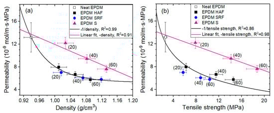 Correlations between permeability and (a) density and (b) tensile strength for neat EPDM and EPDM composites blended with CB/silica. The data for neat EPDM are included as pink and black curves for consistency with the fittings of the filler-blended EPDM composites. The value in parentheses indicates the phr of CB and silica. R2 is squared correlation coefficients of fitting.